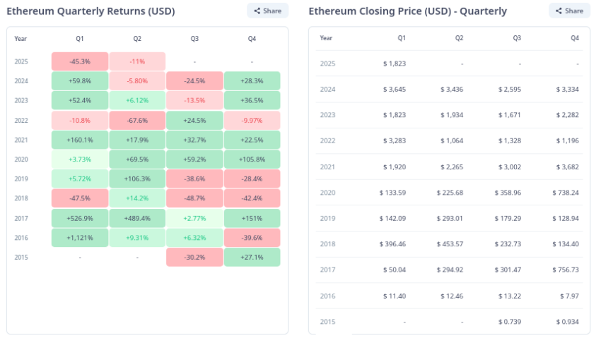 Ethereum (ETH) ha vivido tiempos turbulentos en 2025, con su precio sufriendo una caída significativa del 45,3% en el primer trimestre del año. Esta pérdida se complementa con un desplome superior al 60% respecto a su máximo histórico, lo que ha sembrado incertidumbre en la comunidad cripto y entre los inversores.