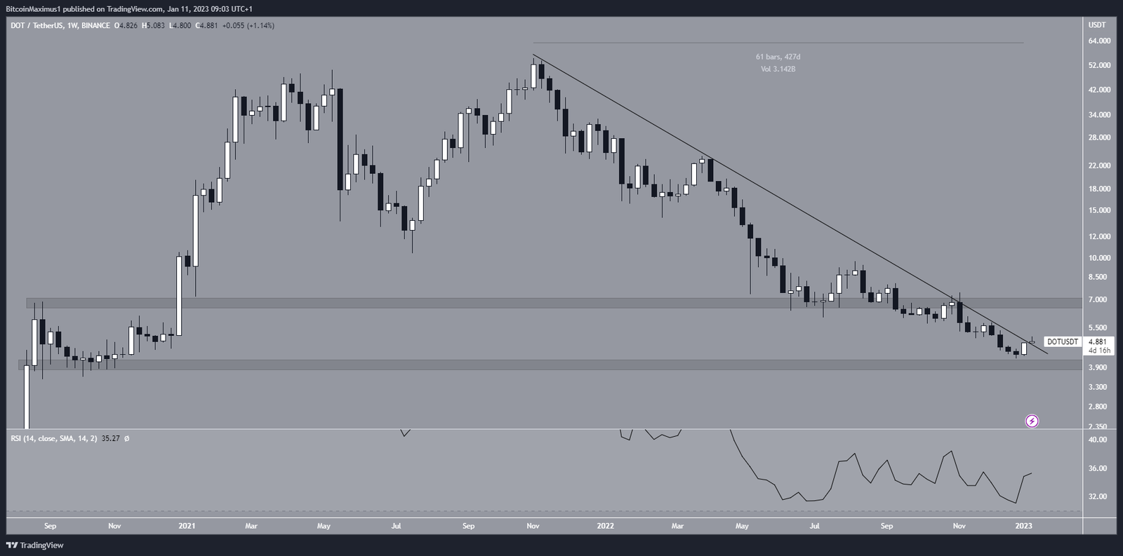 El precio de Polkadot había caído bajo una línea de resistencia descendente desde noviembre de 2021, cuando alcanzó un precio máximo de 55.10 dólares. El movimiento a la baja llevó a un precio mínimo de 4,22 dólares en diciembre de 2022.