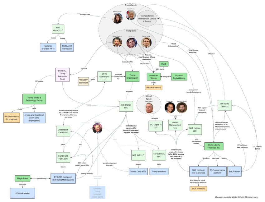 Por ejemplo, Don Jr. mencionó anteriormente que la Organización Trump no tenía conocimiento del plan del monedero, pero esta empresa no emitió la carta de cese y desistimiento. World Liberty Financial y FIGHT FIGHT FIGHT son todas entidades separadas con empleados superpuestos, pintando un panorama confuso.
