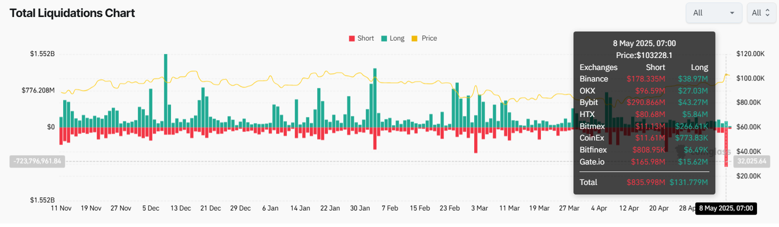 Según datos de CoinGlass, alrededor de 190,000 traders fueron liquidados, con pérdidas totales alcanzando los 970 millones de dólares. Las posiciones cortas fueron las más afectadas, representando 836 millones de dólares en pérdidas.