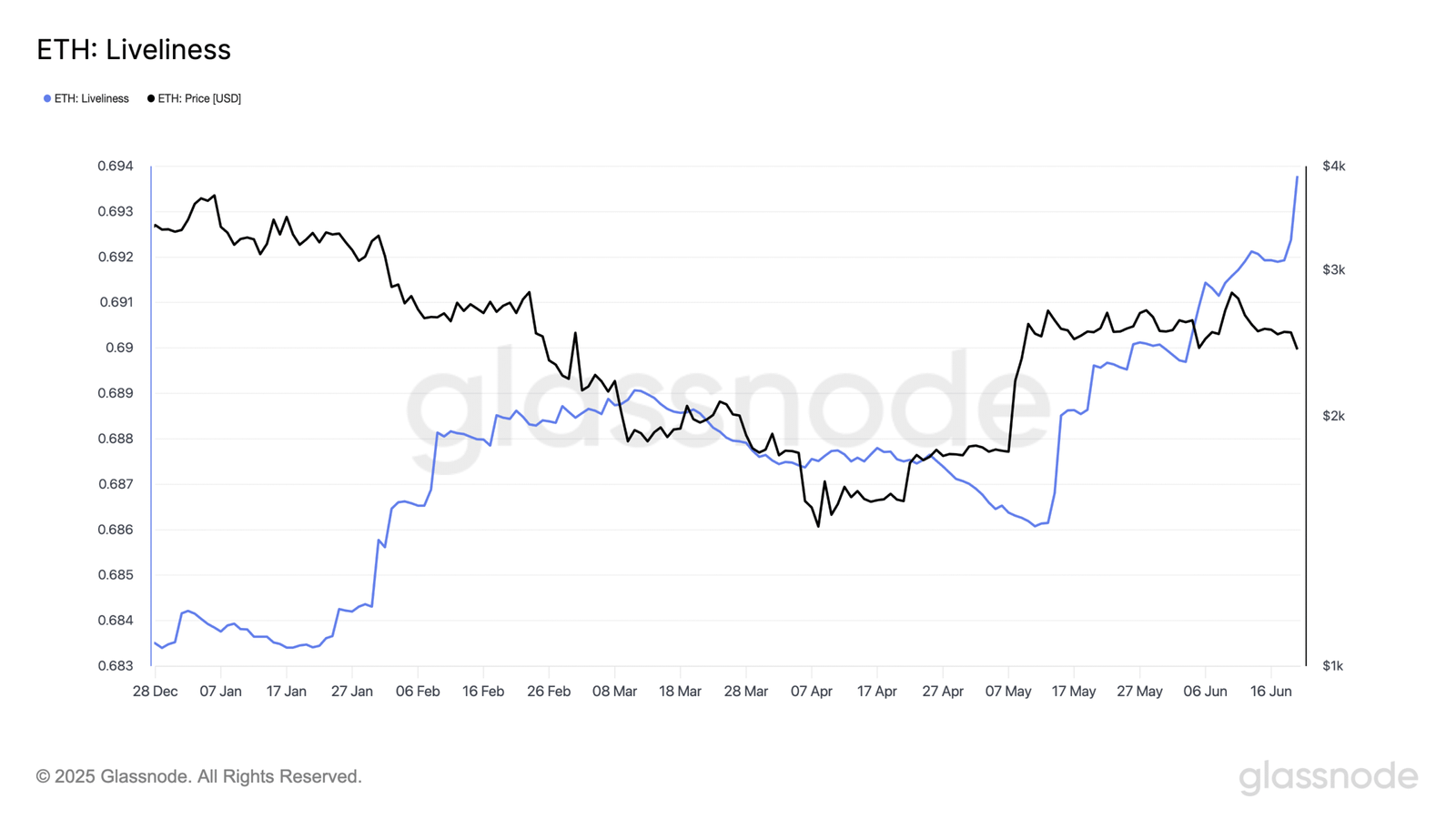 Según Glassnode, el Liveliness de ETH se disparó a un máximo histórico de 0.69 durante la sesión de trading del viernes.