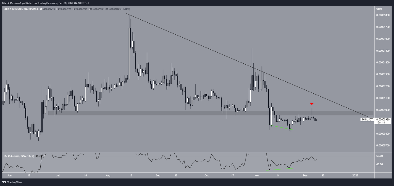 El precio de SHIB ha caído por debajo de una línea de resistencia descendente a largo plazo desde el 15 de agosto. La línea provocó numerosos rechazos (círculo rojo) entre el 29 de octubre y el 4 de noviembre. Se desplomó rápidamente por debajo del área de soporte de 0,0000097 dólares poco después, alcanzando un mínimo de 0.0000081dólares el 22 de noviembre.
