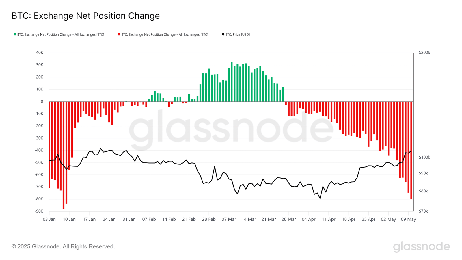 La métrica indica que se están retirando más monedas de los exchanges de las que se depositan, un signo clásico de acumulación.